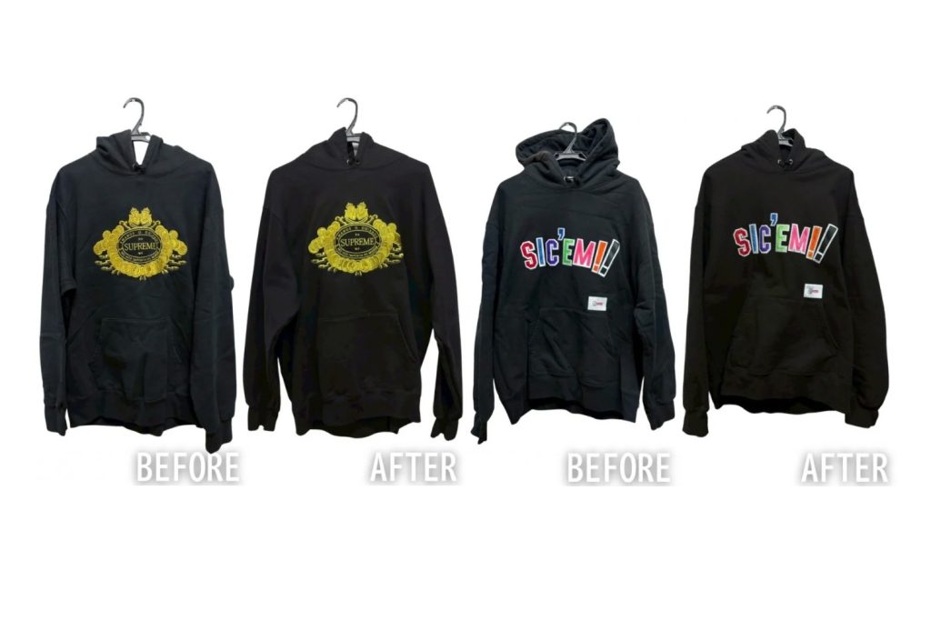 今回の場合、右トレーナーの刺繍ワッペンは一部汚染が見られました。