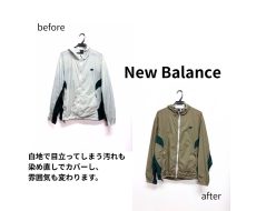 【New Balanceブルゾン】素材:ナイロン100%染め色:ベージュ(基本カラー)染め直し料金:¥6500(500gとして)(アイロンプレス代・税別途)全体を浸け込んで染めるため、内側やブランドタグ等も染まる可能性がございます。